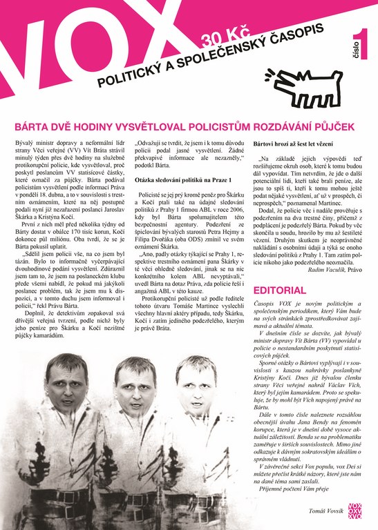 Z obrazových materiálů jsem si našel fotografii Kristýny Kočí. Dále jsem udělal koláž z nakopírovaných výřezů obličejů z fotografie Víta Bárty. Tyto výřezy jsem pak nahradil hlavami Elvise Presleyho na slavném popartovém obrazu od Andyho Warhola. Ze svého vlastního digitálního fotografického archivu jsem vybral ilustrační fotografii pro téma korupce – streetartové kresbu postavy, která sestává z jednotlivých těl. Jako znak pro časopis jsem použil slavnou kresbu psa od malíře Keitha Haringa.