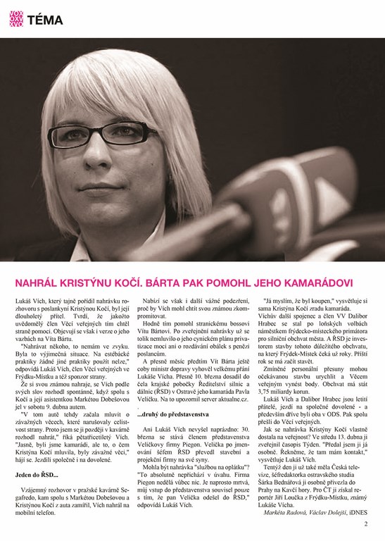 Druhý článek je do jisté míry tematicky spřízněný, a proto bude moct být v rubrice „téma“. Článek mimo jiné vypovídá o spekulacích motivu Lukáše Vícha, který stojí za nahrávkou Kristýny Kočí, ve které se dotyčná zmiňuje například o plánovaném puči proti straně Věci Veřejné.