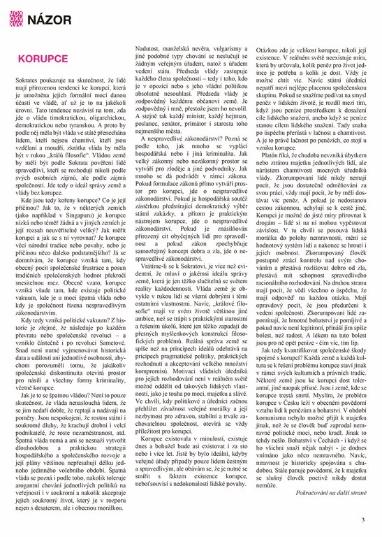 Jako třetí text využiji blogový příspěvek Jana Bendy o korupci ze serveru Aktualne.cz. I když se jedná o publicistiku, stále se držím hlavní linie tématu. Sekci krátkých názorů vytvořím z komentářů pod tímto blogem.