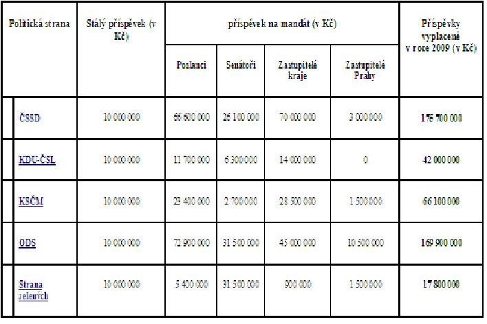Ministerstvo financí na svých webových stránkách uvádí údaje o vyplacených státních příspěvcích za rok 2009. Pro ilustraci lze uvést výši příspěvků u tehdejších parlamentních stran.