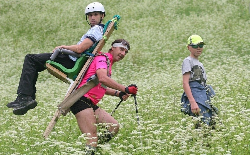 Šerpa Zdeněk Pácha s hendikepovaným Michalem Šmídem na sedáku. Doprovod jim při výšlapu na Lysou horu dělá jeho devítiletý syn David.