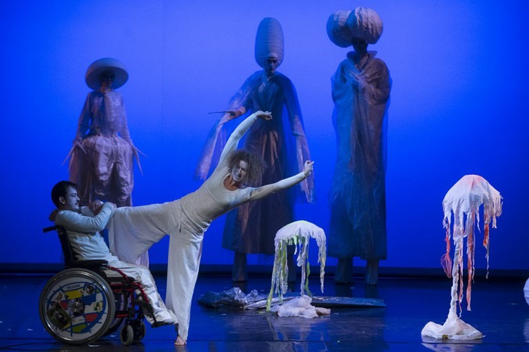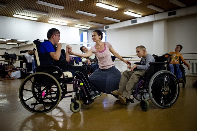 Do vestibulu ostravské konzervatoře doslova vlétne mladá žena s neposlušnými vlnitými vlasy a jde si na recepci pro klíč k baletnímu sálu. Čekám na ni, takže vím, jak se jmenuje. Alžběta Kosová, lektorka tance a pohybu Bílé holubice, má na sobě rozevlátou sukni a tematické černé tričko s nápisem „postiženi uměním“. „Tak půjdeme,“ říká směrem ke mně a k ostatním čekajícím, se kterými jsem se již stihla letmo seznámit. Dneska budou tančit Michal a Káťa na vozíku, nevidomá Kajka a dále Anička a Zuzka s Tomem a Ondrou, kteří mají po dětské mozkové obrně problémy s motorikou.