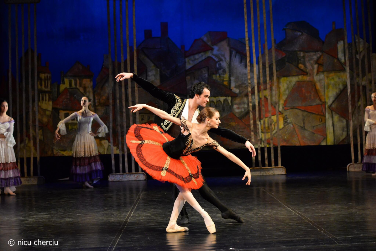 Dynamiku představení podtrhlo využití rekvizit, které do této hry neodmyslitelně patří. Pánská část souboru v čele s představitelem Espady (Mircea Munteanu) předvedla precizní práci s toreadorskými pláštěnkami, které v jejich rukou doslova vířily vzduchem. Naopak dámská část souboru dodala scéně ladnost skrze hru s vějíři. Největší pozornost na sebe však strhla Adeline Gribrincea, která zvládla náročnou dvojroli. Jako temperamentní Kitri ovládla jeviště svou energií a fyziky náročnými skoky, ve snové scéně se proměnila v křehkou a něžnou Dulcienu, což byl naprosto zásadní kontrast.