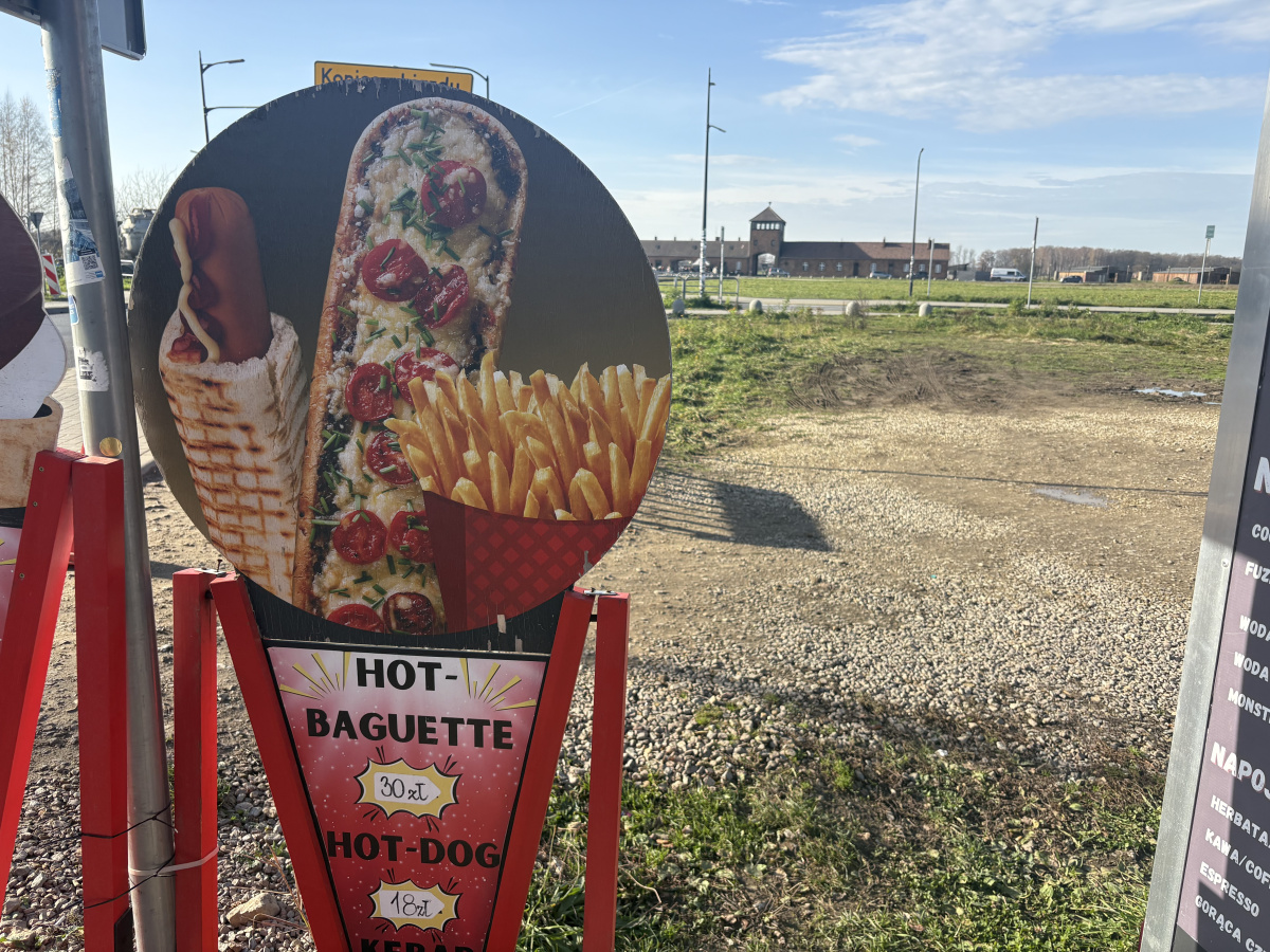 Přímo u výhledu na ikonickou „bránu smrti“ v Birkenau se nachází stánek s rychlým občerstvením, kde v nabídce nechybí kebab, hranolky, hot dog nebo bageta. Tento stánek je zasazen do panoramatu historického prostoru – nedaleko parkoviště a v těsné blízkosti hlavní cesty k památníku.