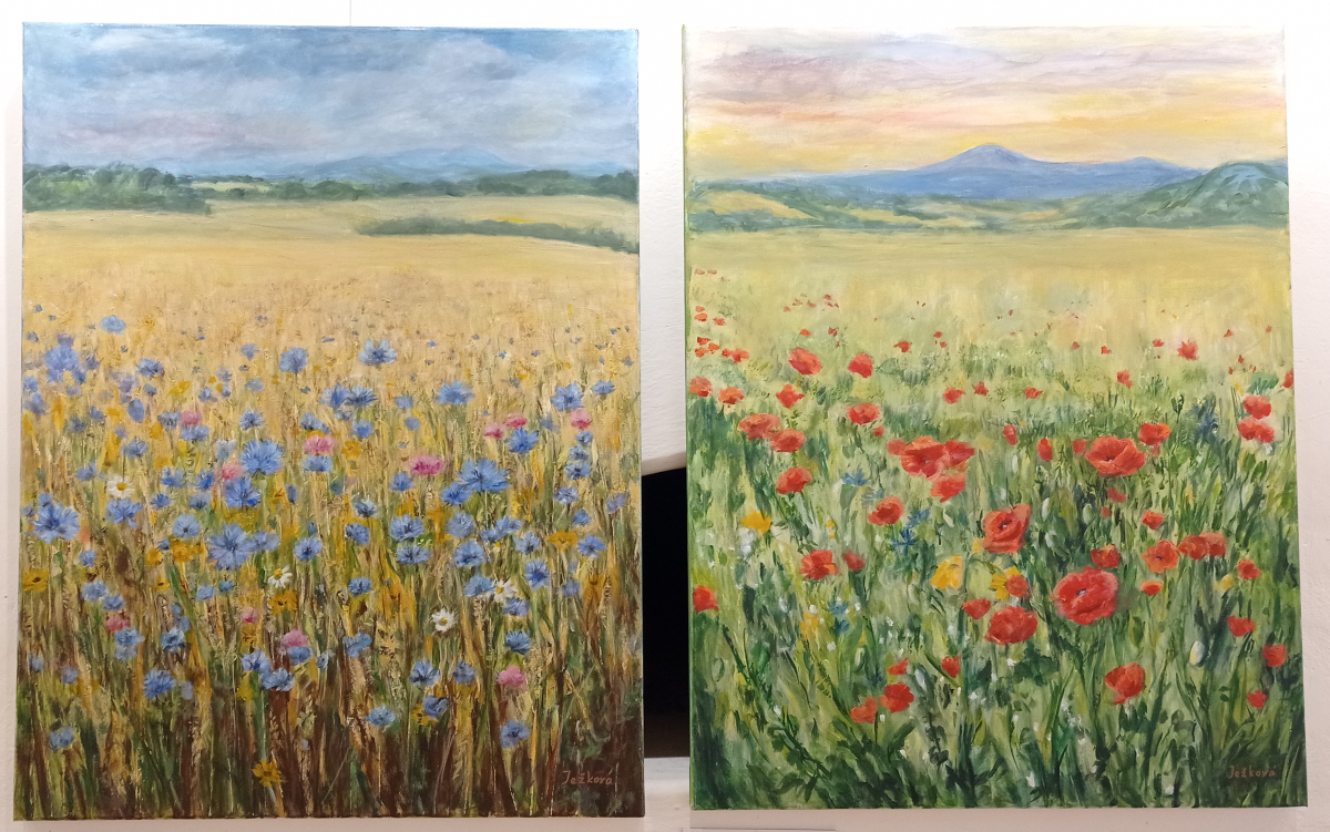 U malého výklenku ve zdi visela dvojice obrazů, která mě zaujala. Chrpy pod Beskydami, kde se na nebi honily bouřkové mraky, byly plné studených odstínů, zatímco Makové pole zachycovalo louku v teplých barvách za úsvitu. Dozvěděla jsem se, že se jedná o duet – dva obrazy, které se vizuálně doplňují.