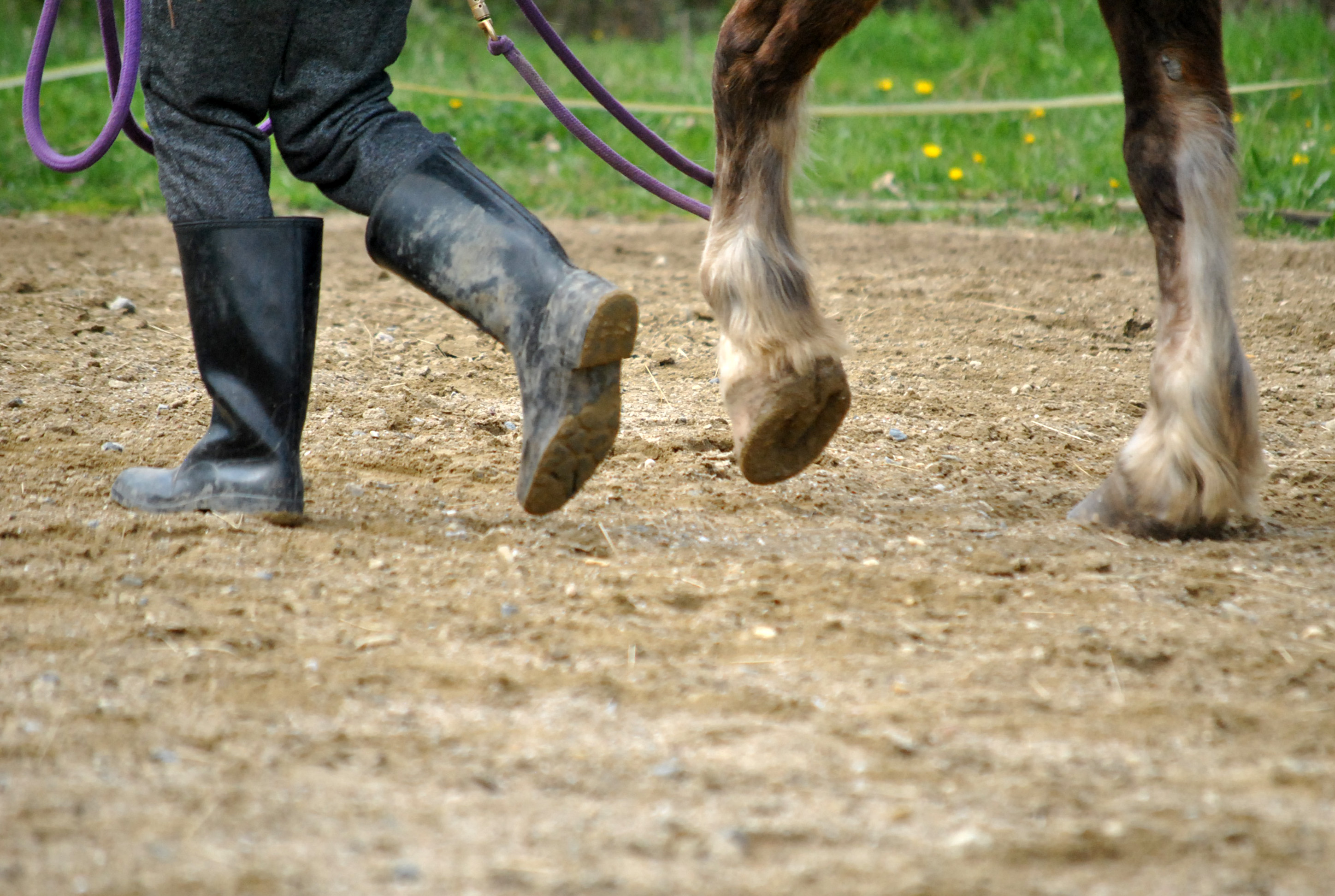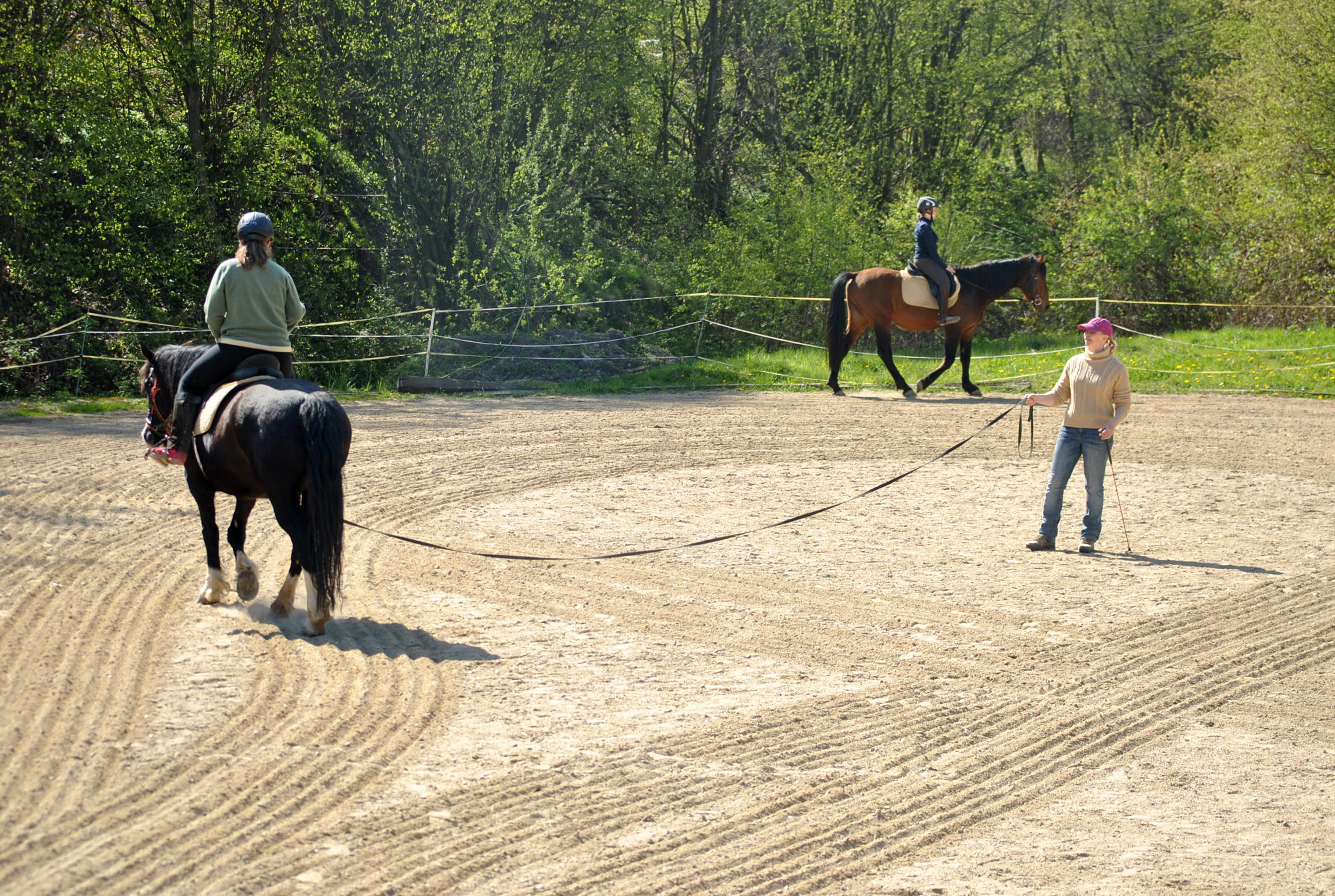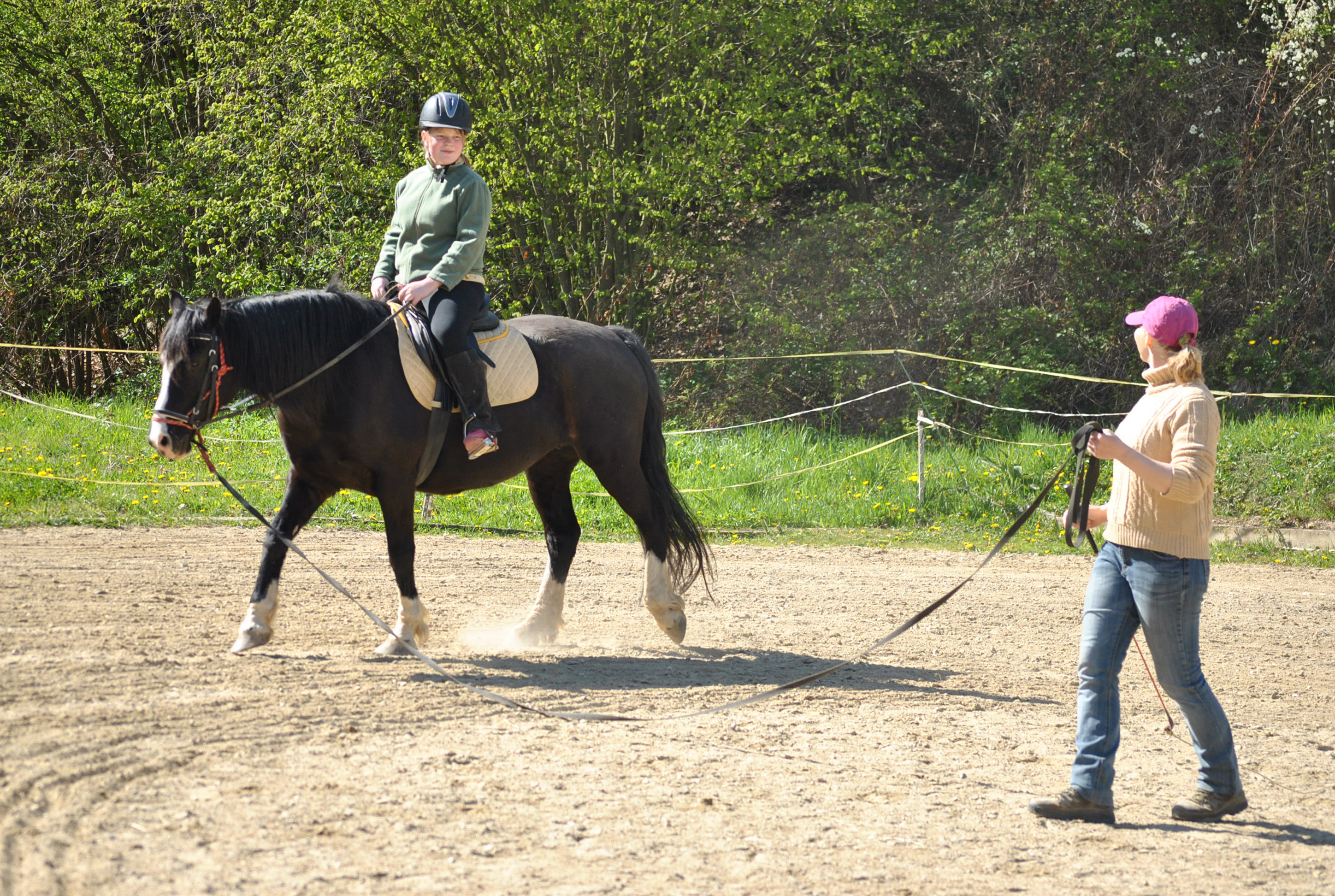 Cvičitel koně vodí na dvou dlouhých lonžích zezadu, aby nepřekážel fyzioterapeutovi a hlavně aby měl lepší přehled o každém kroku koně. I toto vedení je mimo jiné jednou z věcí, ve které musí koně předvést naprostou spolehlivost v rámci hiporehabilitačních zkoušek.