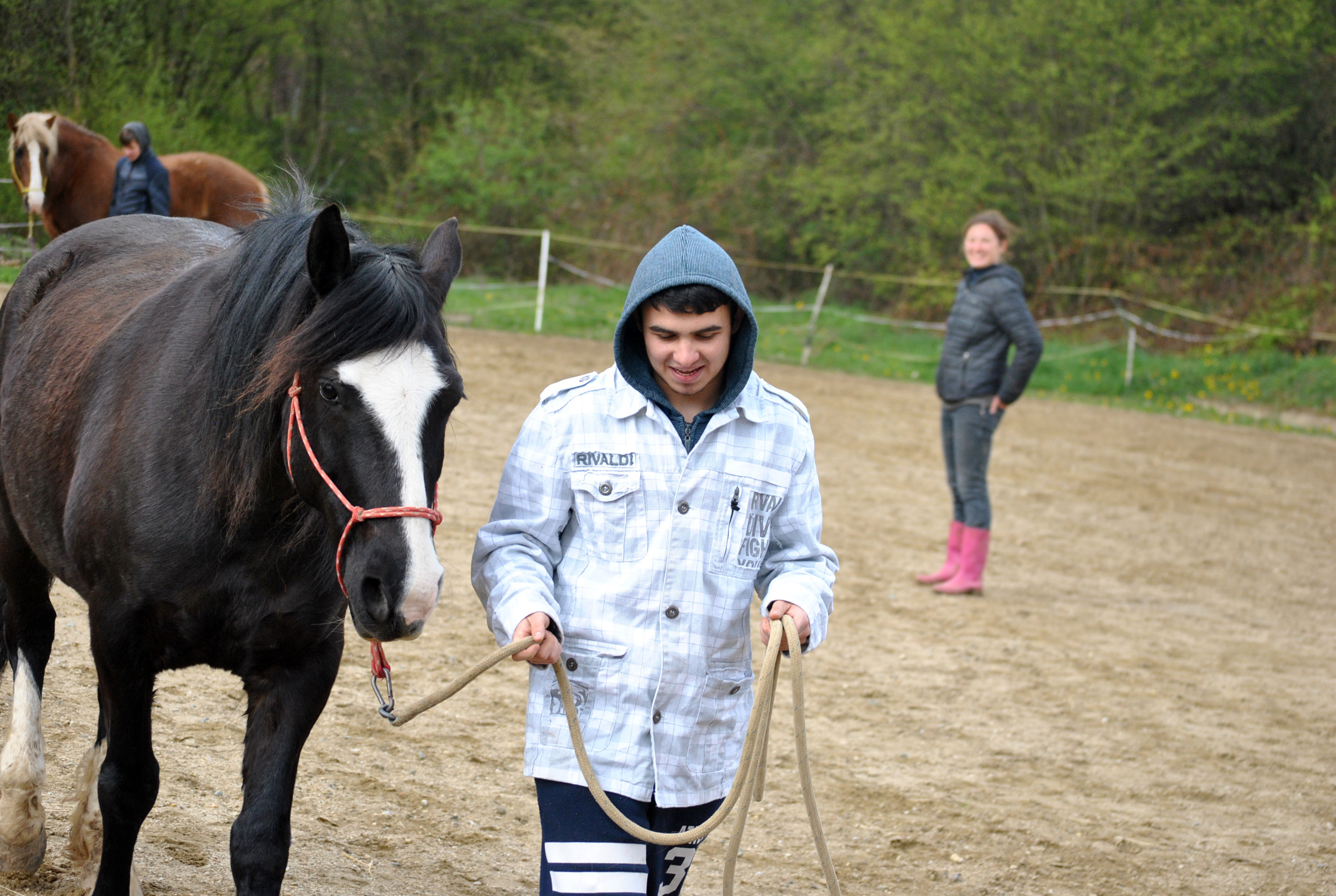 Hlavní překážky, na které jsem během realizace narážela, byly dvě. Jednak se jednalo o rozvrh hiporehabilitací, který bývá jen velmi zřídka pravidelný a ne vždy se shodoval s mými časovými možnostmi. Bylo tedy potřeba se velmi často přizpůsobovat přání klientů. Pokud se toto povedlo, druhým velkým otazníkem se obvykle stalo počasí, které během dubna značně kolísalo a fotografování několikrát překazil déšť. Z původně plánovaných třech návštěv jsem tak nakonec byla reálně schopna zrealizovat pouze dvě. První várka fotografií vznikla při aktivitách s využitím koní ve spojení s psychoterapiemi pomocí koní. Pravidelnými klienty pro tento blok je skupina z výchovného ústavu a střední školy Dřevohostice, což je chlapecké zařízení pro děti s nařízenou ústavní výchovou. Pět přibližně patnáctiletých chlapců do Ryzáčka dojíždí nepravidelně asi jedenkrát za dva týdny. Aktivity s koňmi probíhají pod dohledem cvičitele koní a psychologa. Chlapce nenásilnou formou vedou k lepšímu začleňování do společnosti, upevňování kolektivu, vzájemnému respektu a s pomocí psychologa a zpětné vazby i k upevňování pozitivních životních hodnot a vlastností. Toto fotografování probíhalo venku v dopoledních hodinách při zataženém počasí, ale bez deště. Náročné pro mě v tomto případě bylo nastavit správně na fotoaparátu čas závěrky a clonu, aby bylo možné dostatečně ostře zachytit i velmi rychlý pohyb (například koně i člověka za běhu, ve skoku…) a přitom nebyla fotografie příliš tmavá a nekvalitní.