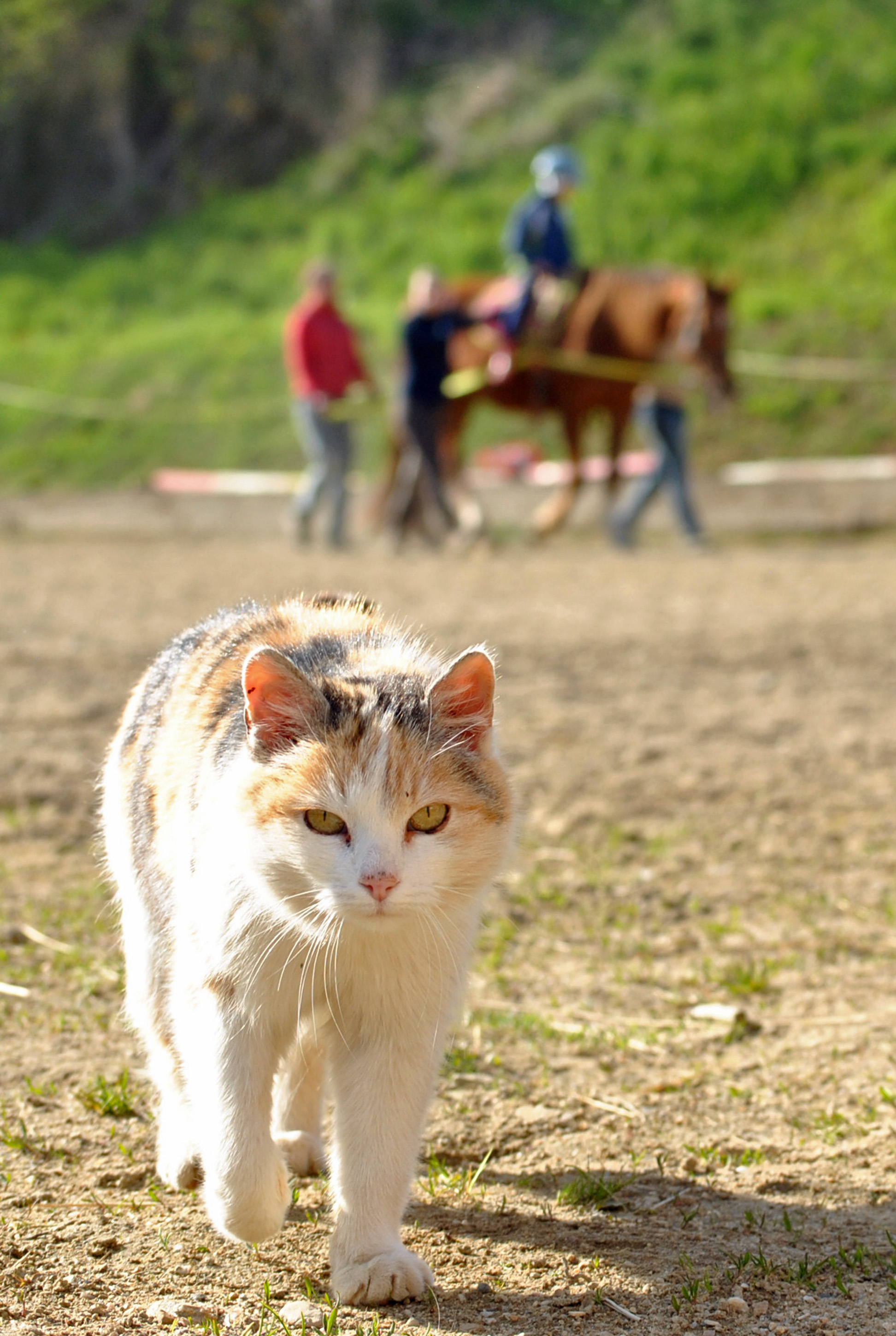 Zatímco hipoterapie jsou v plném proudu a koně jsou v pracovním nasazení, ostatní obyvatelé ryzáčka si užívají odpolední pohody na jarním slunci. I kočky jsou důležitými členy týmu a přispívají k pozitivní energii celého místa.
