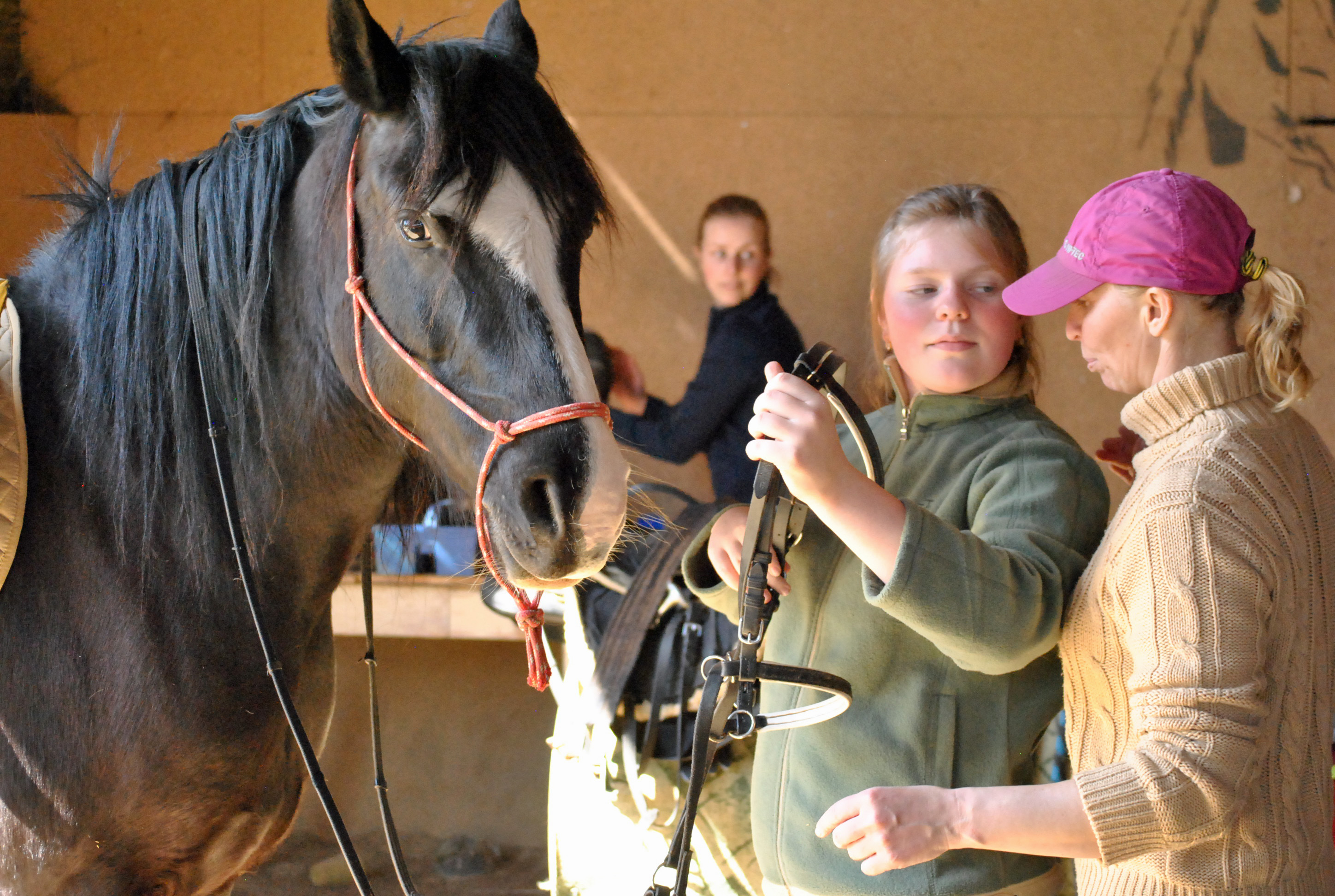Kdo chce jezdit, musí se o přiděleného koně také umět postarat. Bára se učí, jak si Sazi k jízdě připravit a nasadit jí uzdečku.
