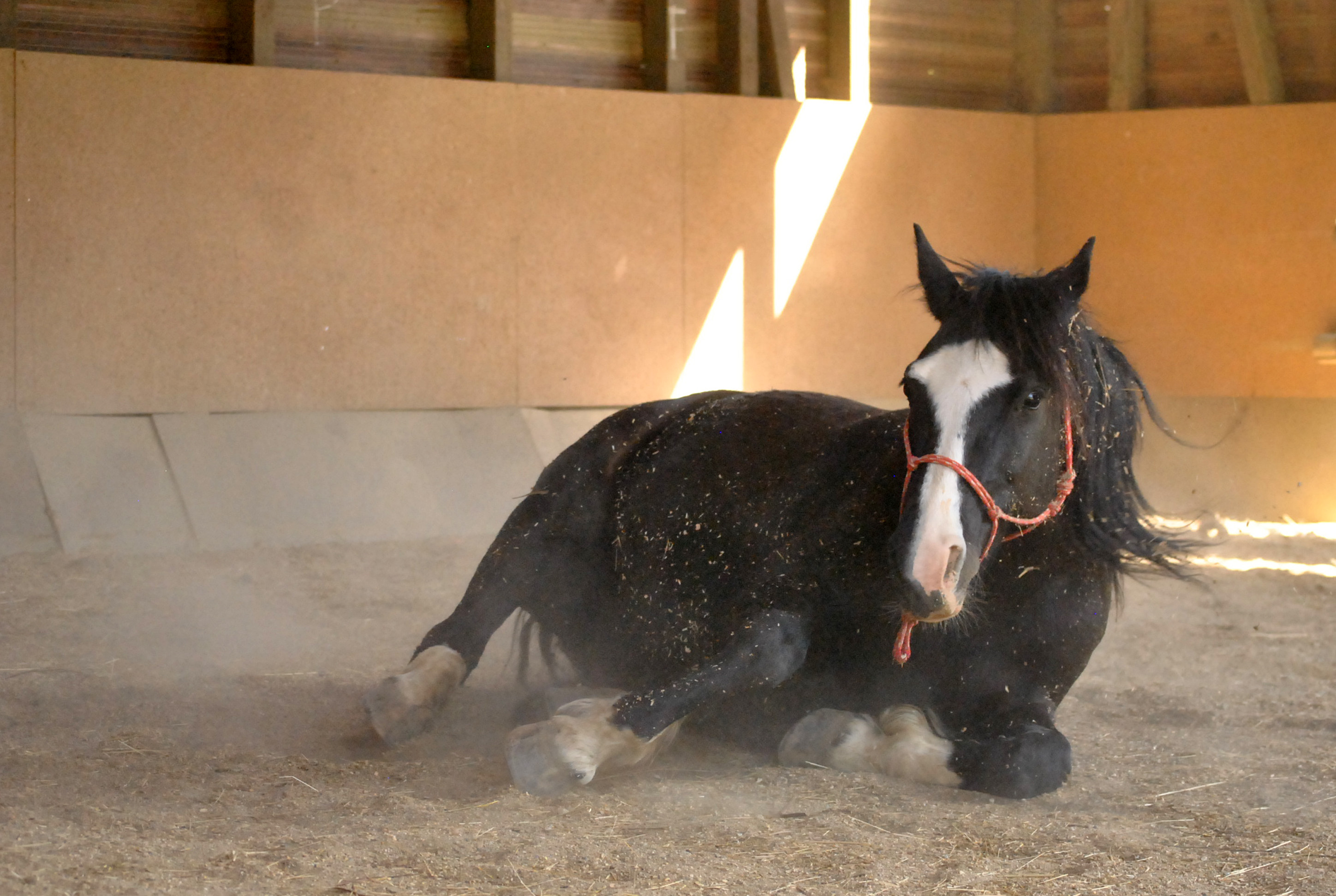 Saze pracovala několik hodin a své odpolední volno si hodlá náležitě užít. Než ji odvedeme do výběhu k ostatním koním, zažene svědění důkladným vyválením v pilinách kryté haly.