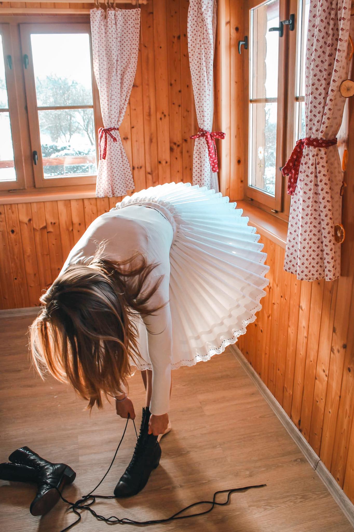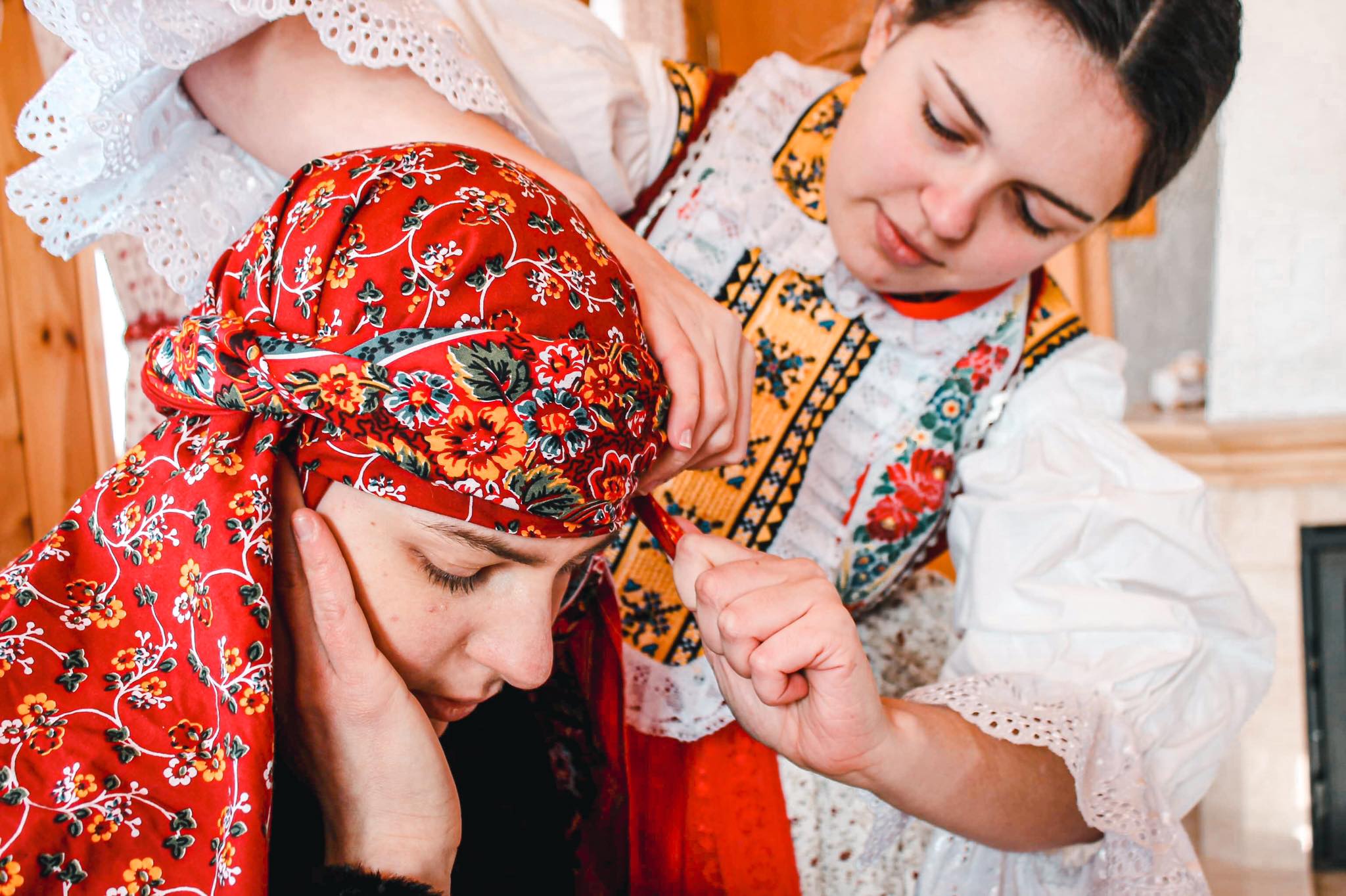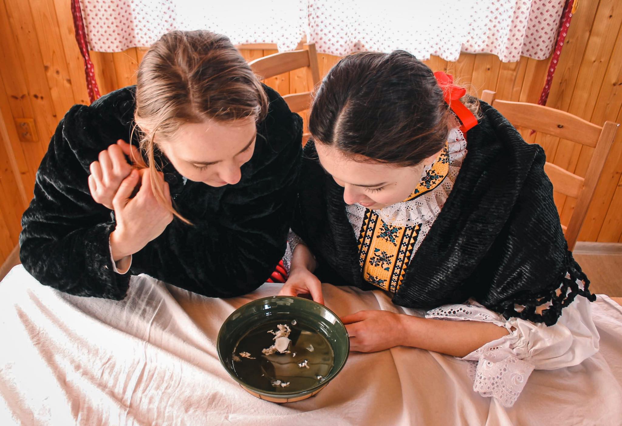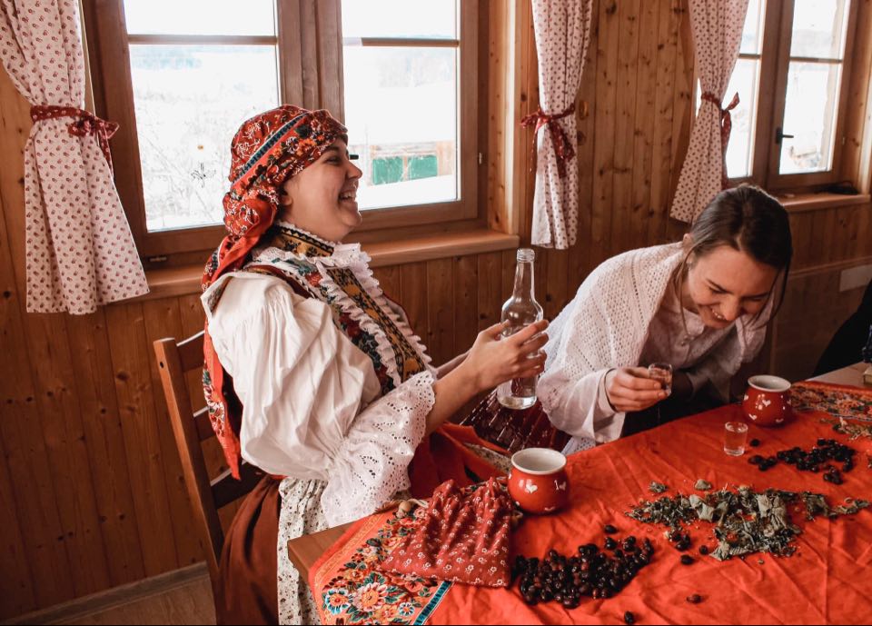 Další zimní focení proběhly v druhé půli února a realizovaly se především v dřevěné chatě, kterou nám pro focení poskytla kamarádka Monika, která se na fotografiích často objevuje. Díky tomu jsem tak měla možnost nafotit vázání turčáku (šátku), oblékání, lití vosku nebo klasické popíjení kořalky v příhodných prostorech.