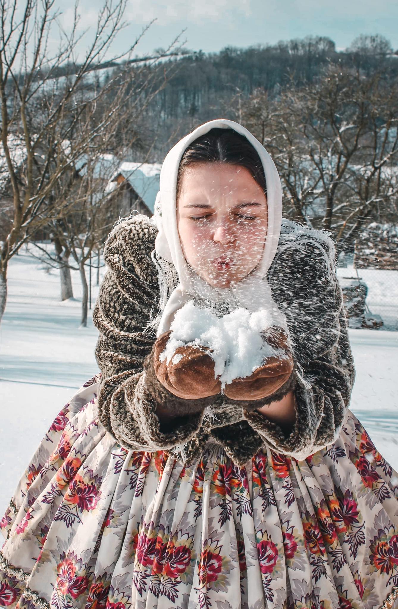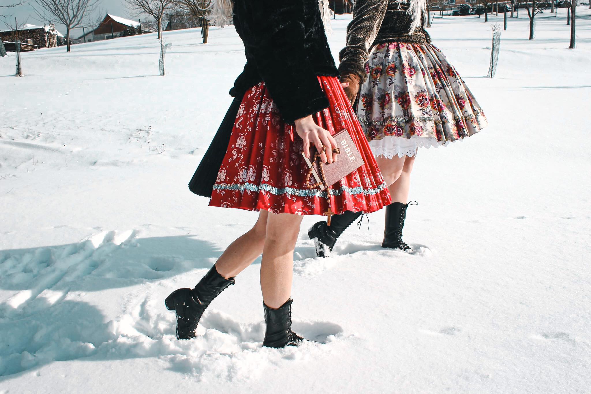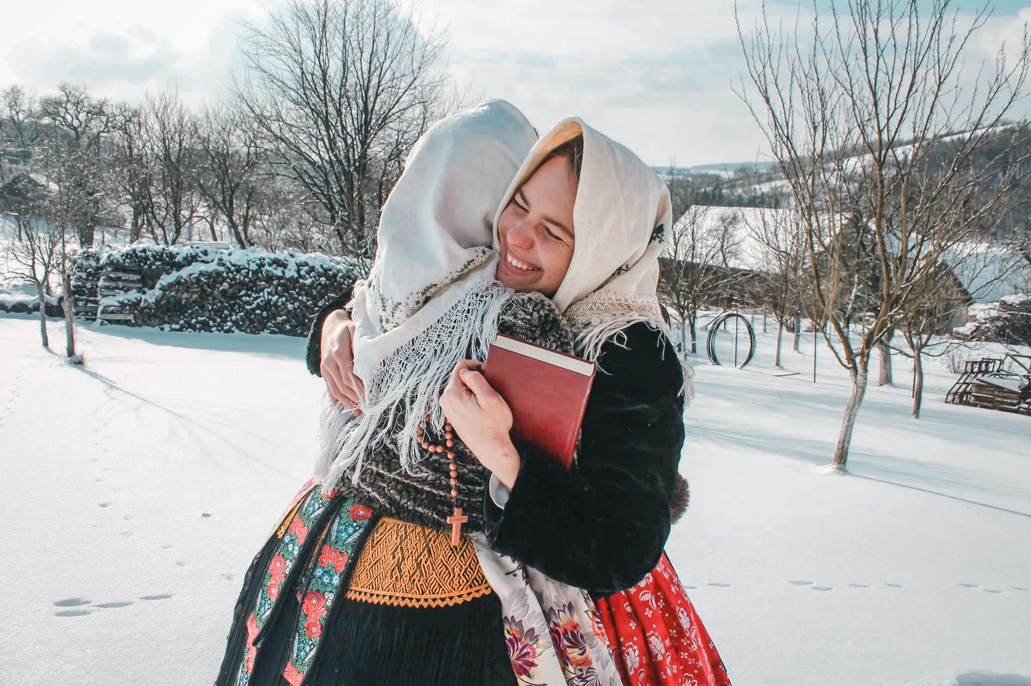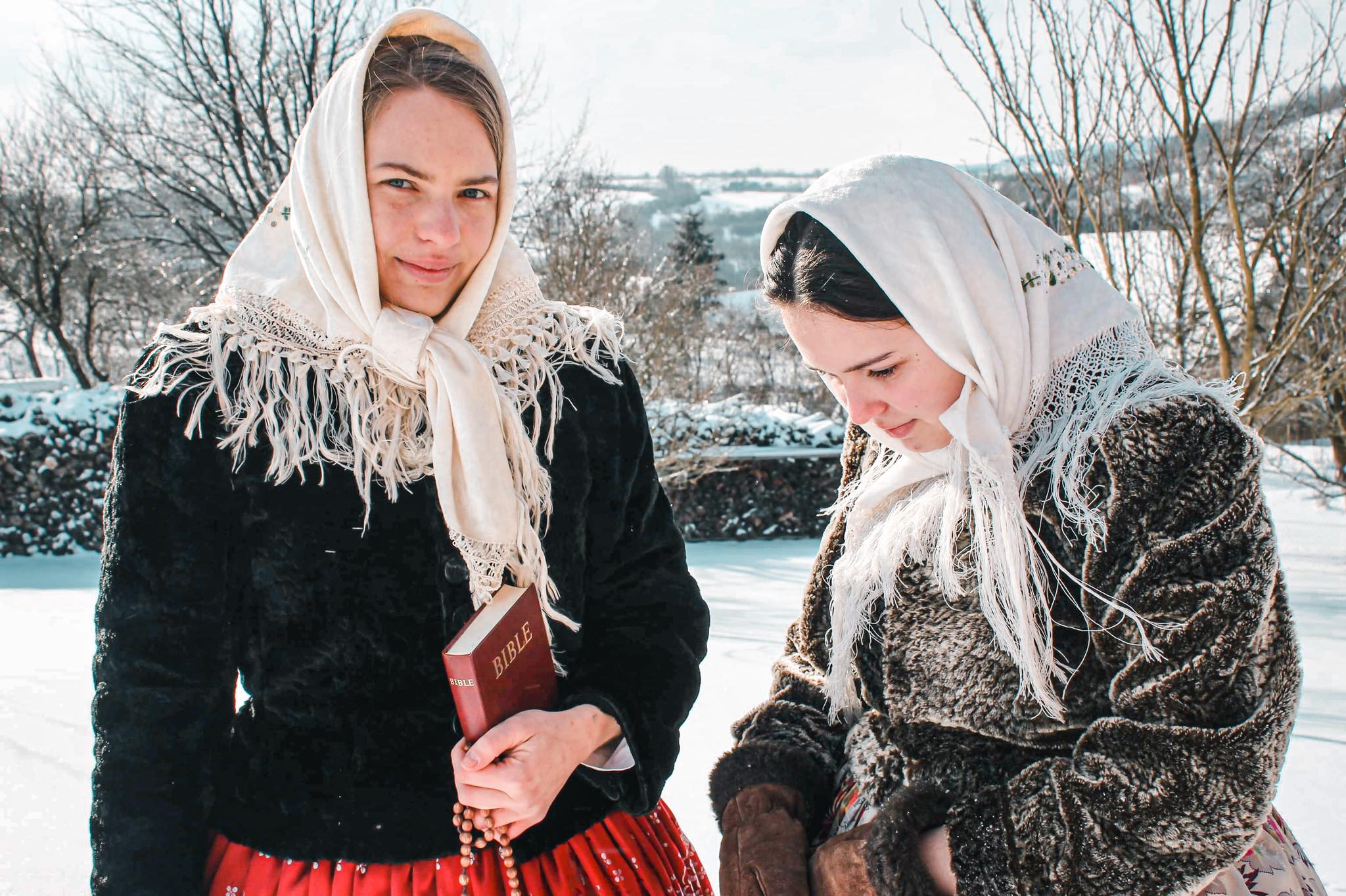 První focení se uskutečnilo začátkem února a cílem bylo především využít čerstvě napadnutého sněhu. Na těchto fotografiích jsem chtěla poukázat především na zimní obdobu kroje, která se výrazně liší od klasické sváteční verze. Dívky tak v těchto krojích vypadají jako „babušky“. Na venkovních zimních fotografiích jsou také často vidět atributy křesťanství v podobě Bible nebo růžence.