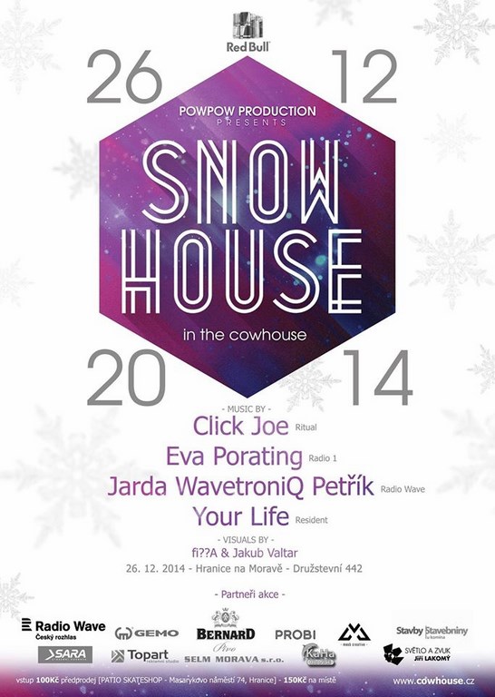 Hranice - Po úspěšném Cowhousu, který Pow Pow Production, pořádali letos v říjnu, se můžeme těšit na další akci, tentokrát nazvanou Snowhouse. Mladá perspektivní partička se snaží do Hranic přivést něco, co tu ještě nebylo. Událost, která se objevila i v doporučených koncertech Radia Wave, se bude konat 26. prosince od dvaceti hodin ve starém kravíně. Na line-upu se opět ukázala velmi zajímavá jména.