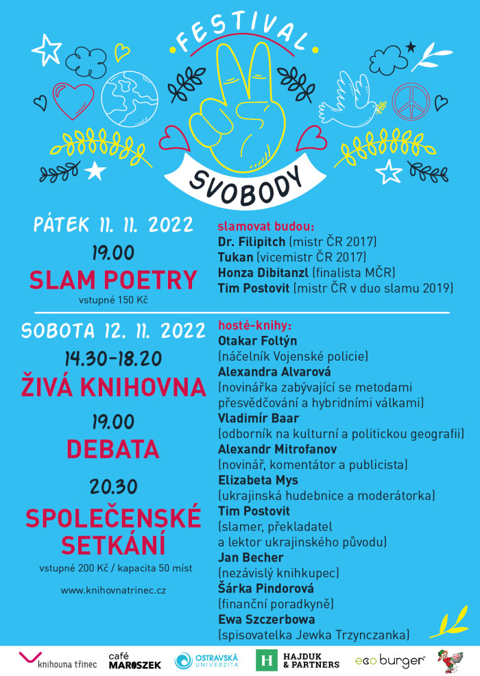 Letos uběhlo 33 let od Sametové revoluce, a při této příležitosti se ve dnech 11. a 12. listopadu konal ve třinecké knihovně Festival Svobody. Účastníci se mohli těšit na večer se slam poetry, ale také na Živou knihovnu. Letošním tématem byla především válka s dezinformacemi, energetická krize a válečný konflikt na Ukrajině.