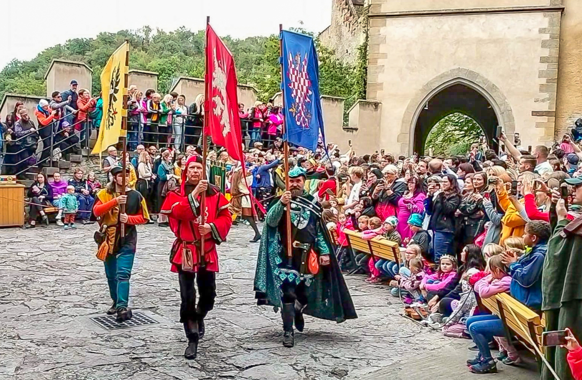 Zlatým hřebem obou dnů byl slavnostní průvod císaře Karla IV. a jeho poddaných. Postupně prošel od vinařské stanice, skrze celou obec, až na nádvoří hradu. Tam se císařští heroldi, rytíři a dvořané odpojili, aby pokračovali do hradní hodovní síně, zatímco Karel IV. s rodinou obřadně a děkovně promluvil ke svým Čechům: „Vězte věrní a stateční Čechové, nechť ruce vaše nejen číši vína sevříti umí, ale i v dobách těžkých ruce s meči na obranu vlasti své pozdvihnou. Bez Čechů statečných, věrně na straně cti a pravdy stojících proti zlořádům a bezpráví, dílo Naše by se nezdařilo, mír a pokoj vlasti by nevzkvétal.“
