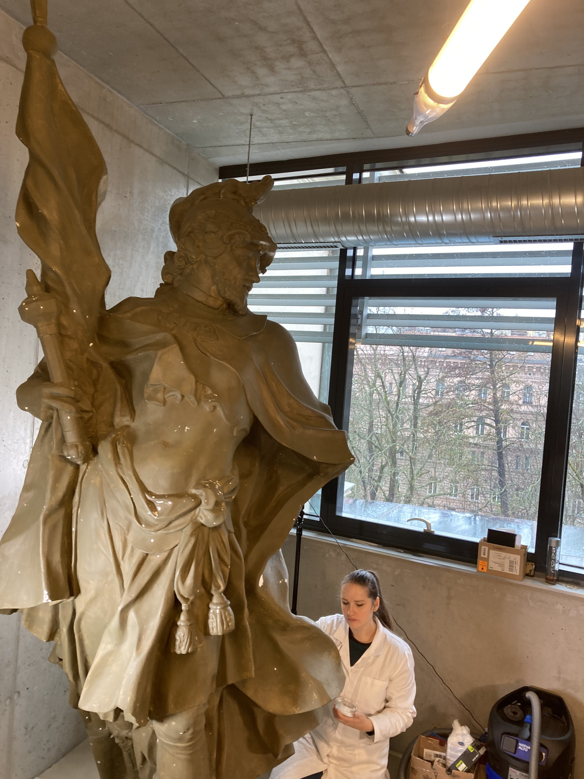 Podle restaurátorky Anety Ševčíkové sochám nesvědčily nevyhovující podmínky na chodbách školní budovy. „Povrchová polychromie byla křehká, odlupovala se v tenkých šupinách a na řadě míst docházelo ke ztrátám celých ploch. Ke zpomalení dalšího stárnutí povrchových vrstev bude zapotřebí provedení různých preventivních opatření; například doporučíme vedení školy, aby ventilace nad sochou byla omezena a kontrolována,“ vysvětluje. Jak dlouho budou práce trvat, nedokáže odhadnout.